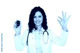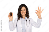 Female doctor wearing lab coat and stethoscope holding a pill and a medicine bottle, smiling on a transparent background