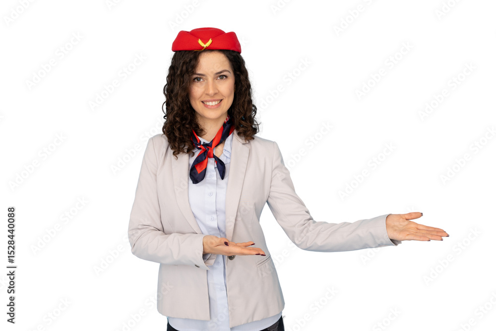 Young beautiful stewardess showing something with hands, smiling and wearing uniform on transparent background