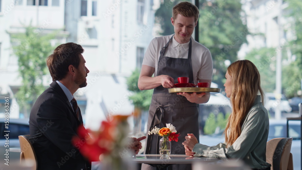 Business colleagues meeting cafe. Friendly waiter bringing coffee to clients