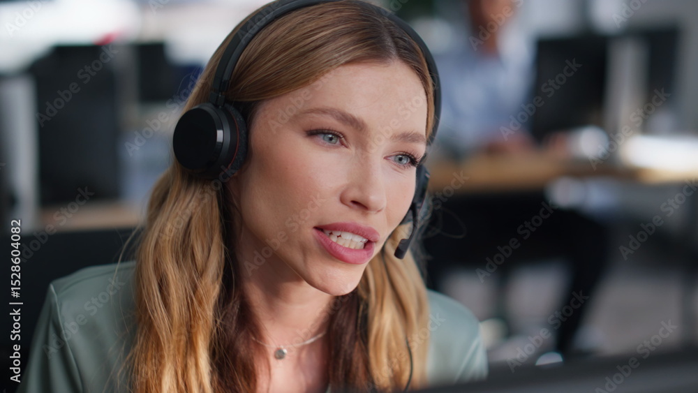 Portrait helpdesk operator helping customer providing support in office closeup.