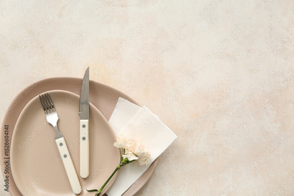 Plates with cutlery, paper napkins and carnation on beige grunge background