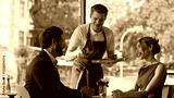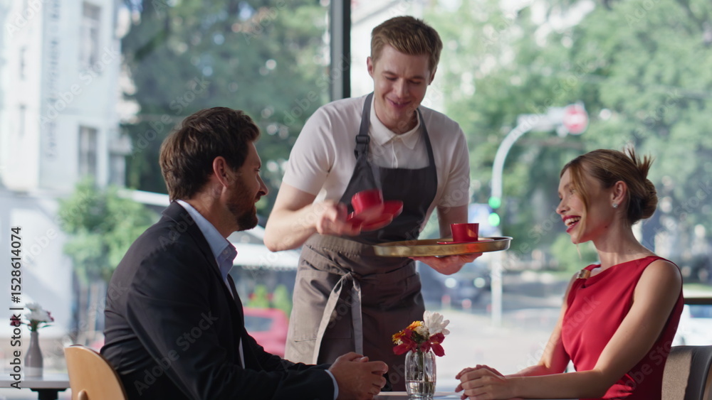 Waiter serving loving couple in restaurant. Worker bringing coffee to dating