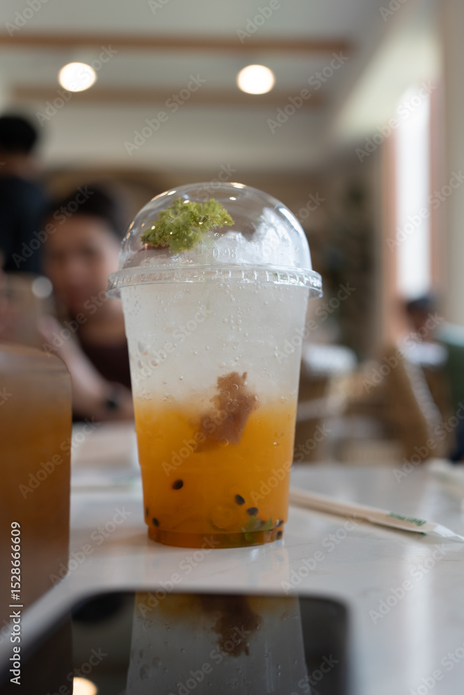 Glass of iced passion fruit soda, refreshing drink or beverage with ice