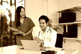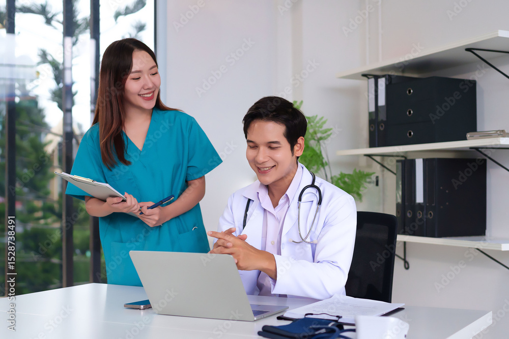 Doctors and Nurses in Consultation: A collaborative scene of healthcare professionals engaged in a discussion, examining medical information using laptop and medical chart.