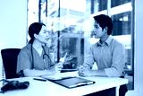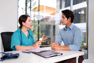 Healthcare Consultation: A caring doctor consults with a patient, engaged in a serious discussion about health and well-being. The doctor presents a bottle of medication.