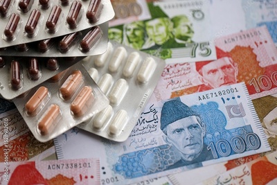 Pakistan rupees banknotes and medicine pills. Pakistan money bills with drugs close up