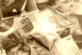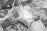 Swiss franc banknotes and cocaine pack. The current francs money bills and narcotic substance