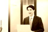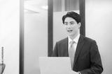 明るい白い綺麗な会議室で、打ち合わせや営業の提案をする商談のビジネスシーンの男性 正面