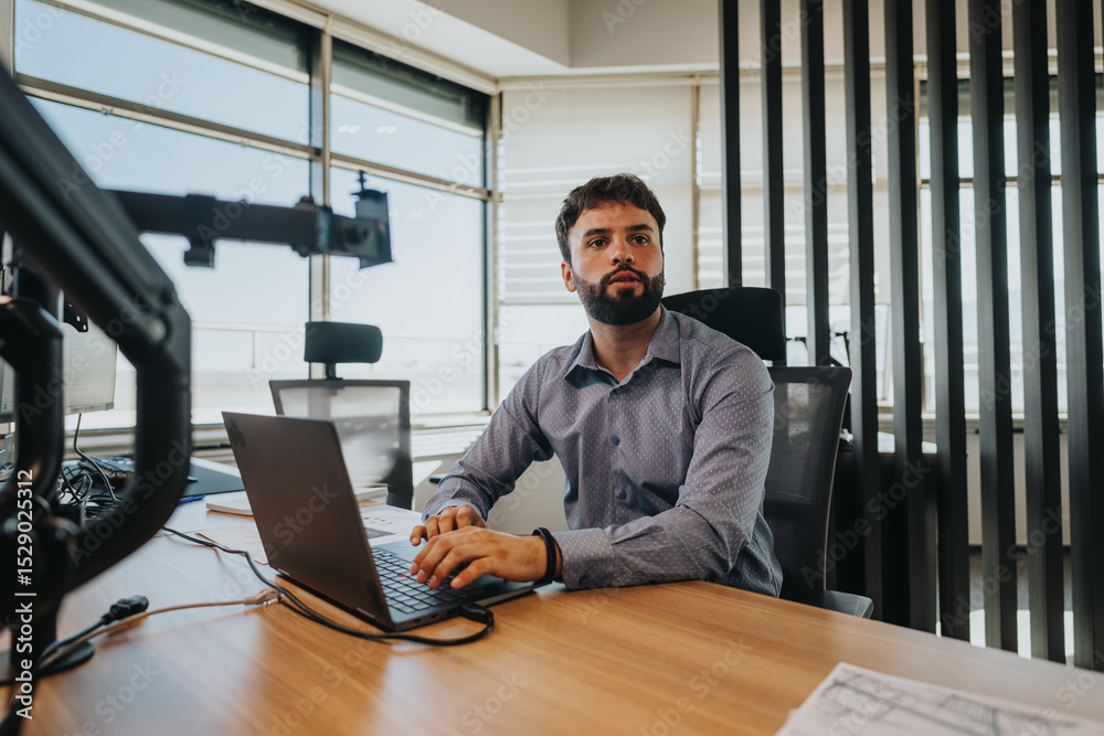 Business employee in modern office working on a laptop, surrounded by professional equipment. The atmosphere reflects focus and productivity, common among business people. Ideal for depicting