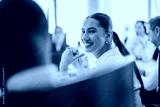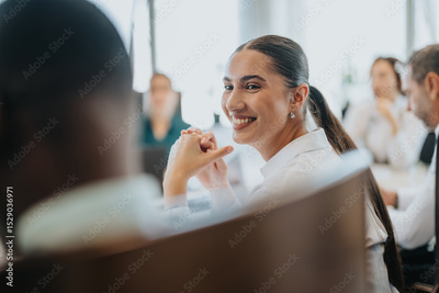 A cheerful businesswoman smiles during a multicultural office meeting, showcasing teamwork and collaboration.