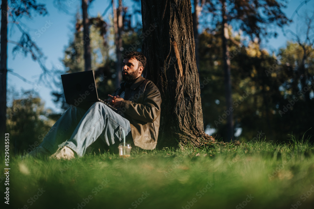 A person sits under a tree in a serene forest, using a laptop for remote work. The natural surroundings provide a peaceful environment for productivity and connection with nature.