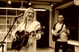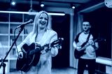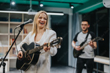 A group of musicians plays acoustic and electric guitars in a brightly lit rehearsal studio. The scene captures the enthusiasm and collaboration of a band practicing their musical performance.