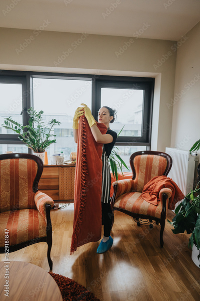A woman tidying a living room, featuring furniture with patterned upholstery, drapes, and houseplants, creating a comfortable and inviting environment.