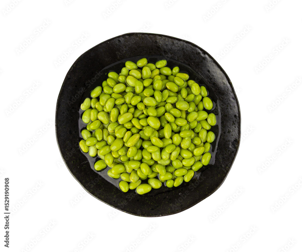 Edamame beans isolated. Green soy bean pile, cooked young soybean, boiled Japanese pea
