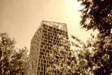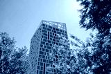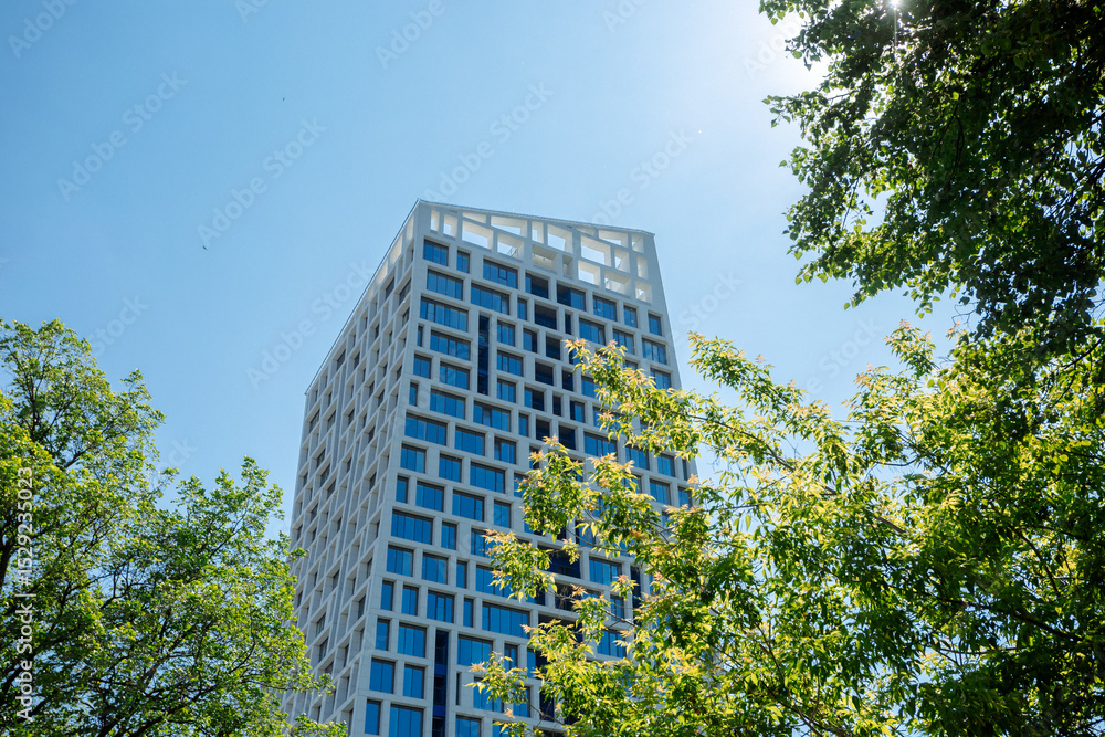 A modern building with a geometric facade, surrounded by green trees, under a clear blue sky. Modern office building with blue sky