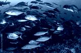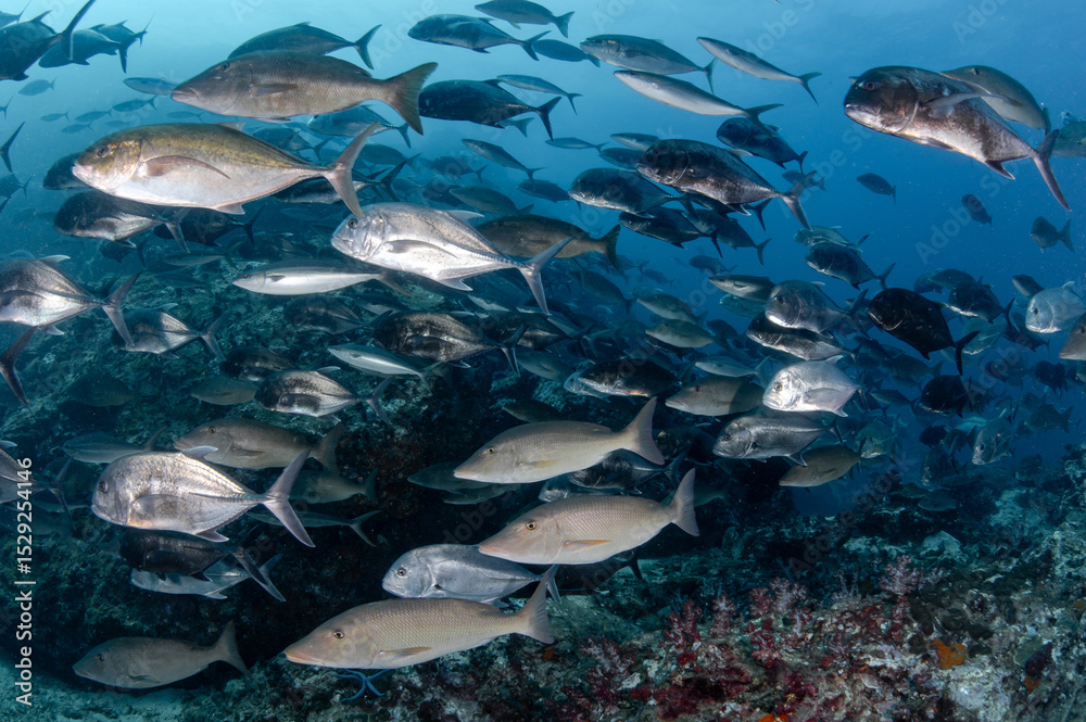 School of Jack fish and longnose emperor at Richelieu Rock, one of the best dive sites for scuba diving in Asia. Located in Andaman sea, Thailand.