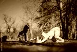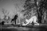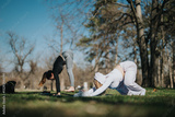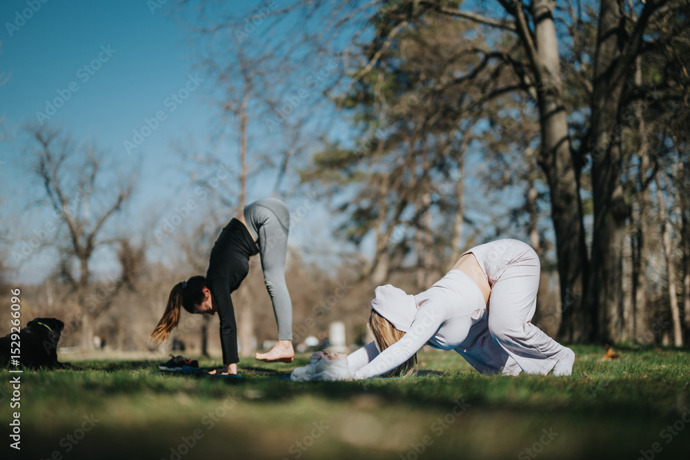 Peaceful outdoor yoga practice between two people in nature, performing poses in a calm park under blue skies. Their exercise session highlights fitness, mindfulness, and connection with the outdoors.