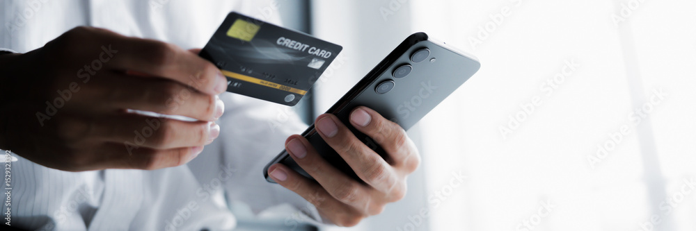A young man holding credit card and using mobile phone for secure online financial transaction at home office