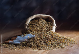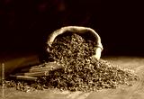 Tobacco sack with heap and few cigarettes on the table, closeup view, soft blur background. Roll-your-own cigarettes manufacture or making cheaper cigarettes for self.