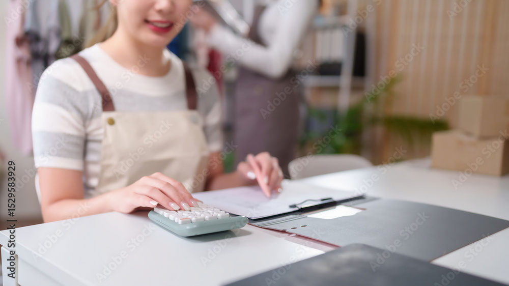 Asian Women Calculating Finances for Small Business Using Calculator on Desk in Home Office for E-commerce Inventory Management Bookkeeping and Online Retail