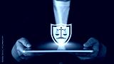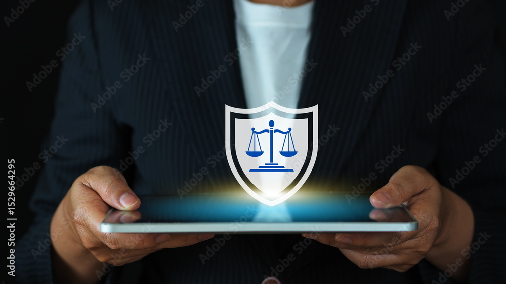 law and technology integration showing shield, justice balance, digital security, and privacy rights defense online.