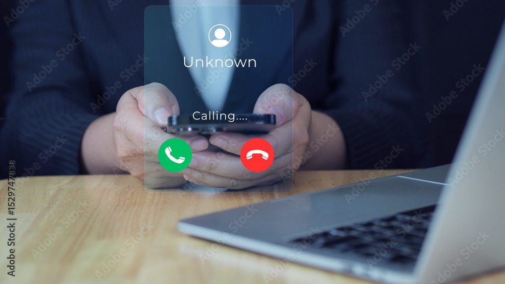 Close-up of a smartphone showing an incoming call from an unknown number. Perfect for office communication, digital communication, and mobile business