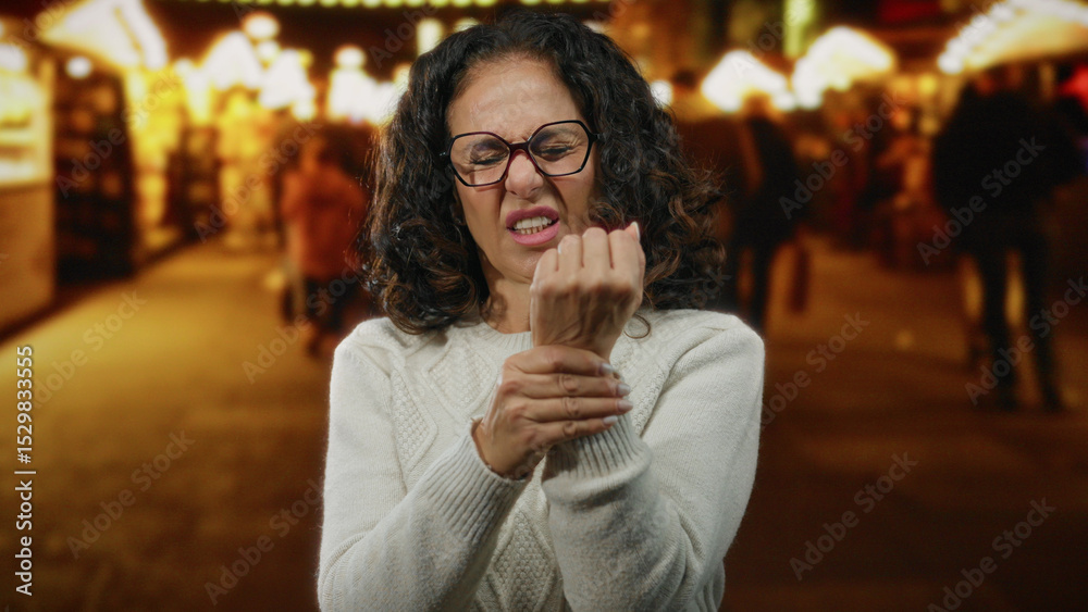 Mature woman with curly hair wearing glasses clutches her wrist in pain on a busy city street at night, surrounded by blurred lights and people.