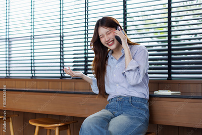 Portrait of Cheerful business Asian woman freelancer making telephone call share good news about project working in office workplace, business finance concept.