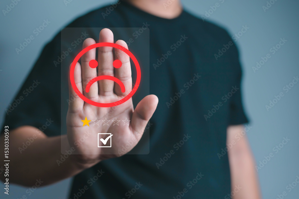 concept customer dissatisfaction experience Unhappy business customer with sad face, bad review, bad service, dislike, poor quality, low rating, bad social media.