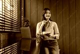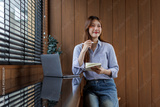 Portrait of young Stylish asian woman manager freelancer working on laptop and note while sitting in cozy cafe. High quality photo