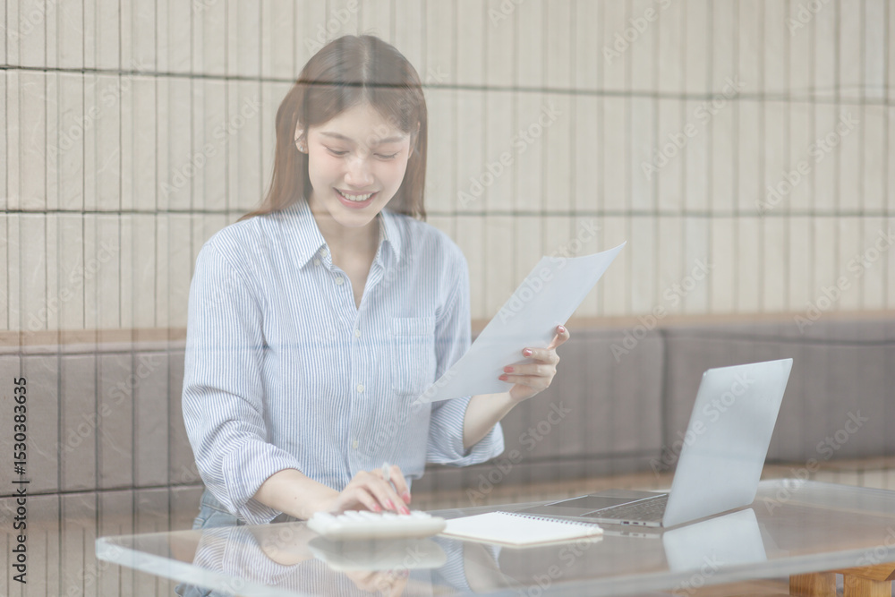 Portrait of young business woman using a calculator to check company finances and earnings and budget, calculating monthly expenses, managing budget, papers, loan documents, invoices.
