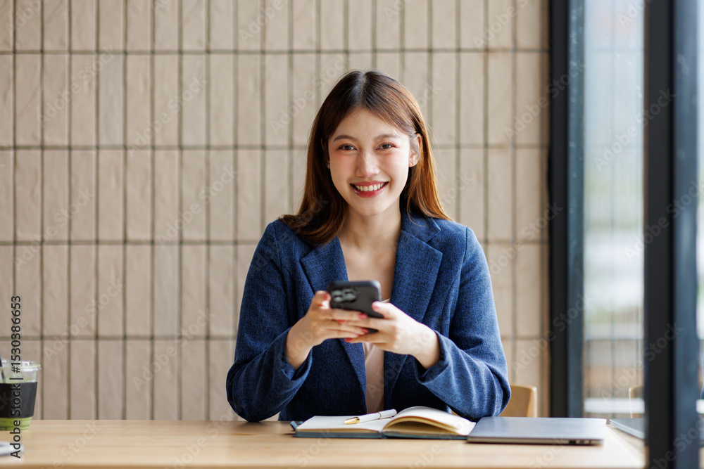 Portrait of smiling beautiful business asian woman using phone in office sme freelance with copy space.