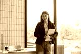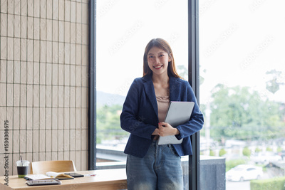 Business, finance and employment, asian female successful entrepreneurs concept. Confident businesswoman in white suit, holding closed laptop pc computer in office