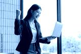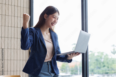 Successful Happy caucasian young woman student freelancer using laptop, watching webinars, working remotely, e-learning e-commerce online in workplace office
