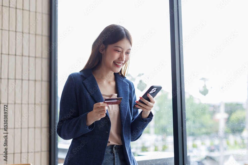 Happy young asian woman holding credit card and mobile phone while standing on desk.