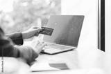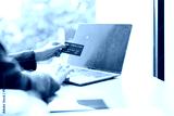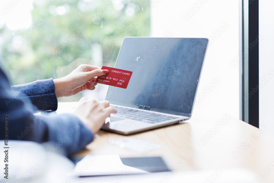 Transfer money online using bank payment card. young asian woman Hands input credit card data using laptop.