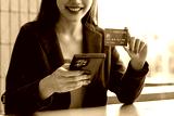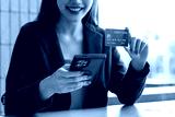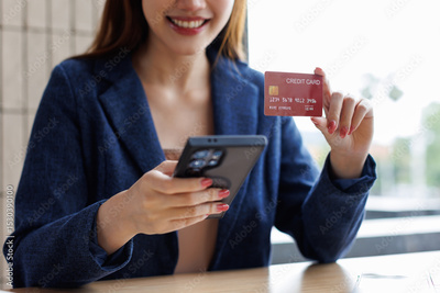 Business woman, hand and credit card for online shopping in payment, e commerce on phone for purchase.asian young woman banking and investing in retail sale for discount, savings for company or projec