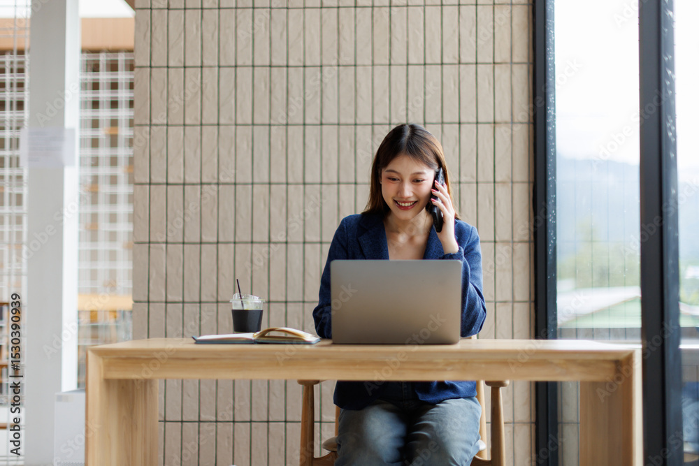 Young Asian businesswoman talking on the phone with her business partner, dealing or negotiating business deal over the phone, working in her office.