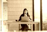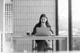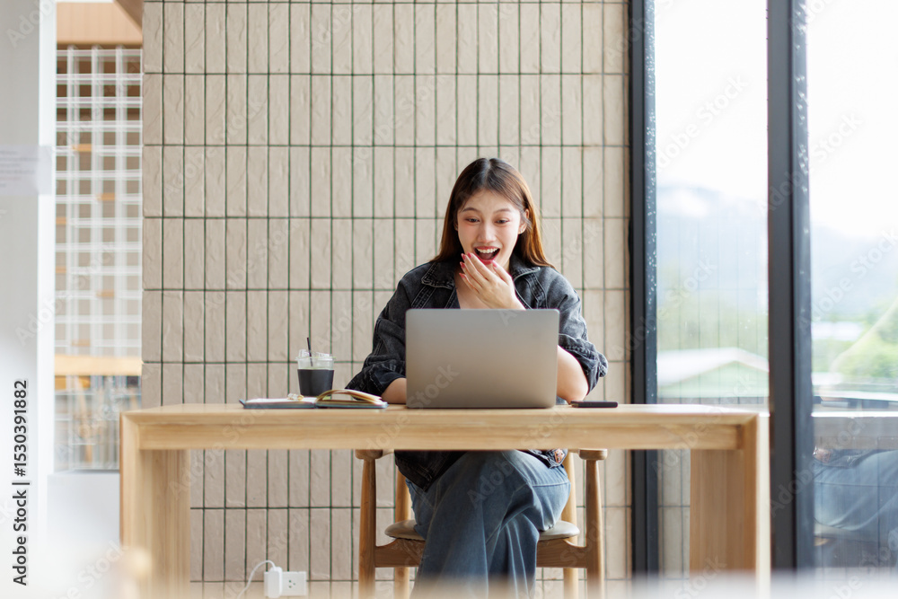 Happy young asian girl learn english language online with computer laptop.discussing a project, and working in her modern office.