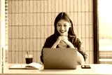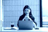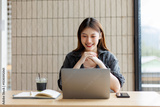 Happy young asian girl learn english language online with computer laptop.discussing a project, and working in her modern office.