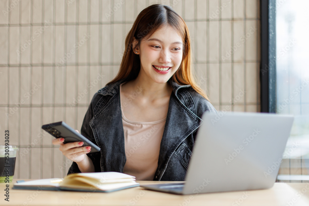 happy young Asian woman in casual clothes using her smartphone and laptop while working remotely at a coffee shop on the weekend.