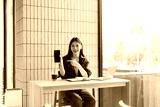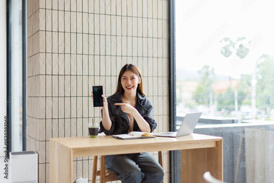 happy young Asian woman in casual clothes using her smartphone and laptop while working remotely at a coffee shop on the weekend.