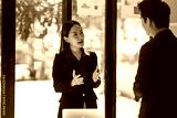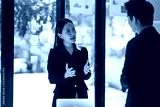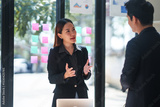 Businesswoman engaging in a project discussion with her colleague, using sticky notes to illustrate ideas in a bright, modern office setting