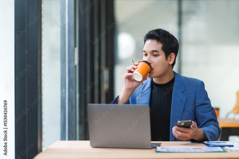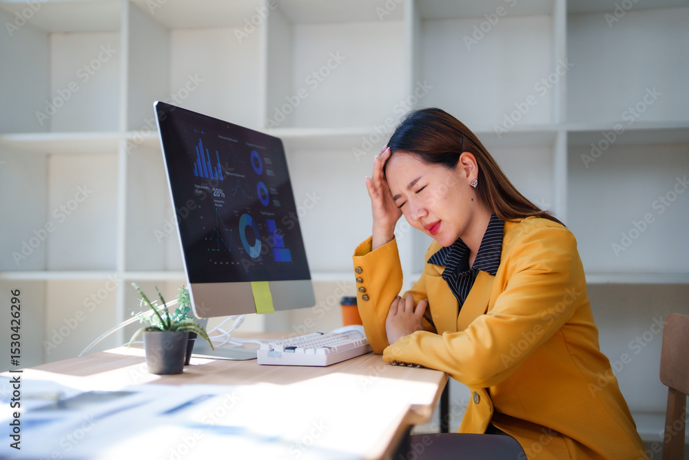 Asian businesswoman suffering from headache and touching her head while working on computer with bad financial result in office