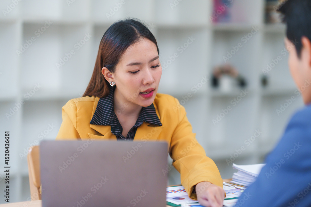 Business colleagues discussing project strategy using laptop and financial chart documents at office desk