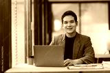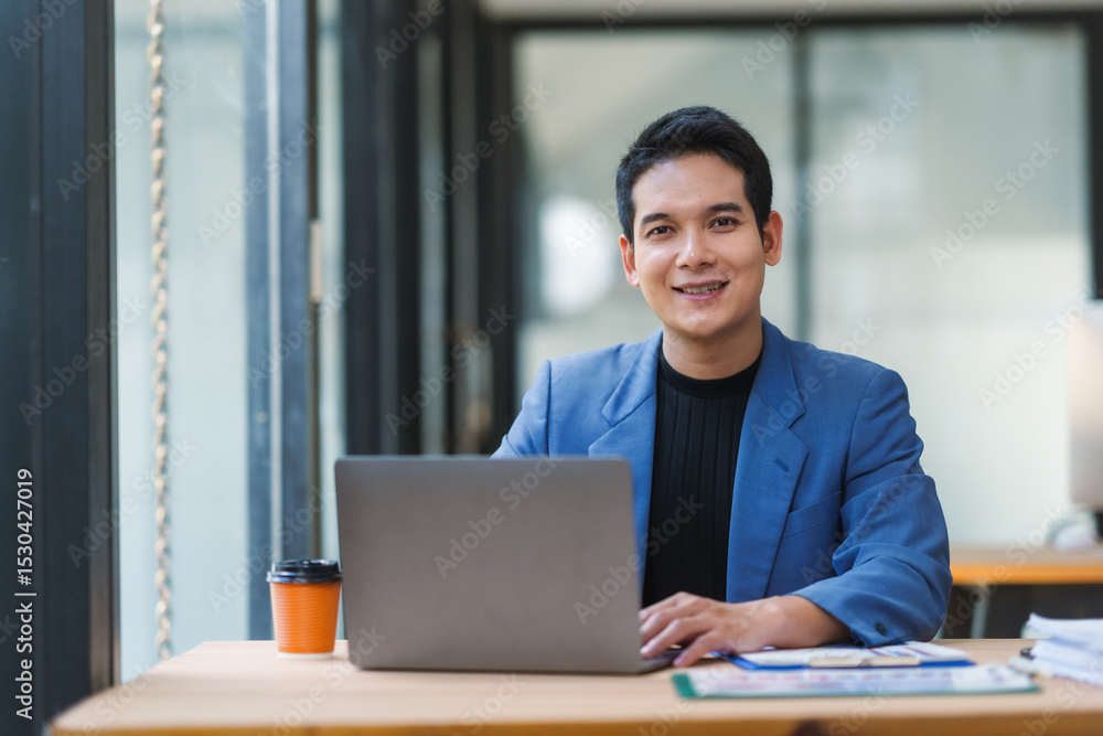 Young, happy entrepreneur working on a laptop in a bright, modern startup office, exuding confidence and professionalism in a stylish environment