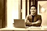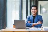 Portrait of a smiling Asian businessman sitting at his desk with crossed arms, exuding confidence and professionalism in a modern office environment
