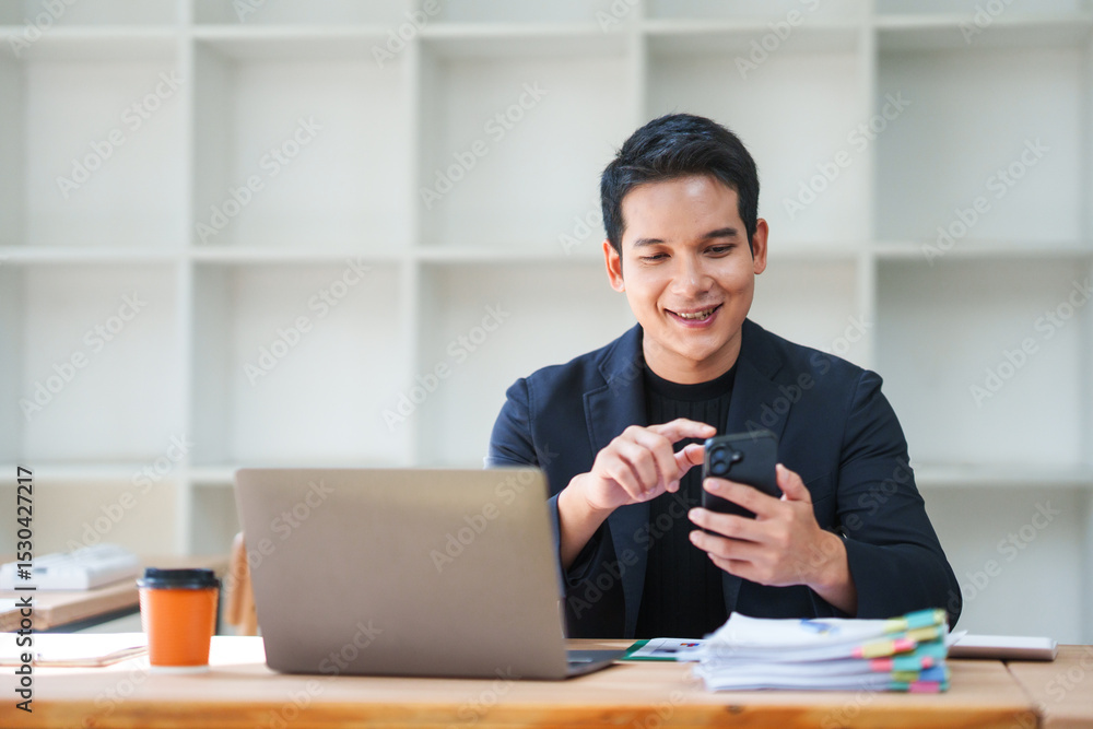 Young happy entrepreneur browsing internet on mobile phone while working on laptop in bright modern office