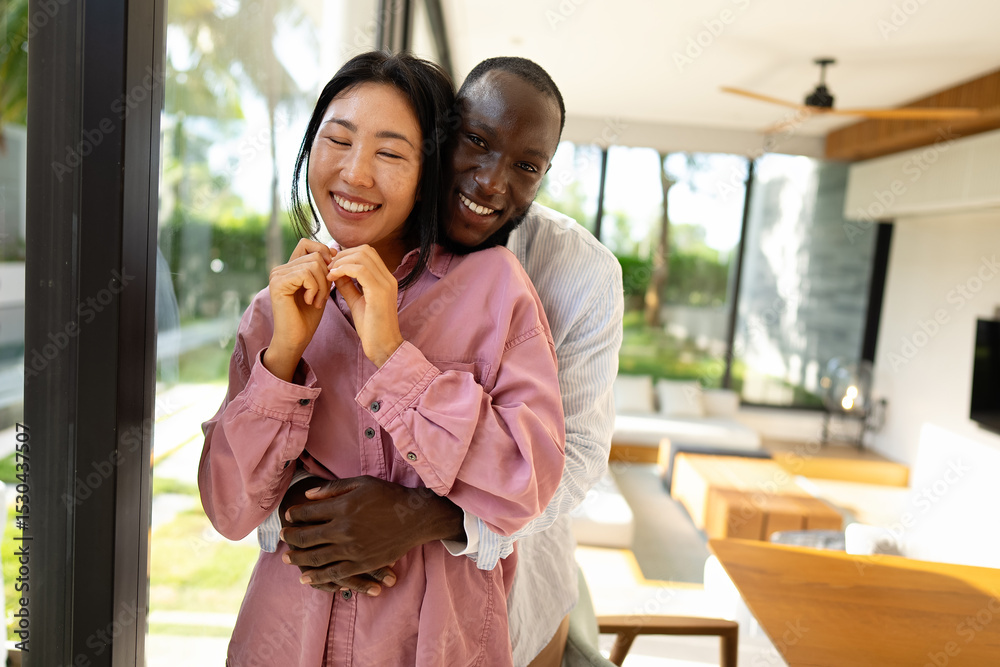 Excited child-free multiethnic couple embracing and laughing in modern living room, calm lifestyle