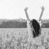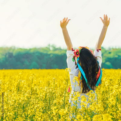 Beautiful young woman in Ukrainian embroidered standing in a field of yellow rape flowers.back view